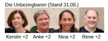 Manche Mannschaften hatten schon Spiele und 4 Aktive konnten sich schon mal in der Liste eintragen. Im Moment überwiegen die Damen mit Kerstin Fehse, Anke Fiedler und Nina Farhid. Der einzig männliche Vertreter ist Rene Göldner. Alle liegen mit 2 gewonnenen Spielen vorn. Die nächste Liste erscheint ab 10.09.. Wie diese dann aussieht, wird sich zeigen….. von PB