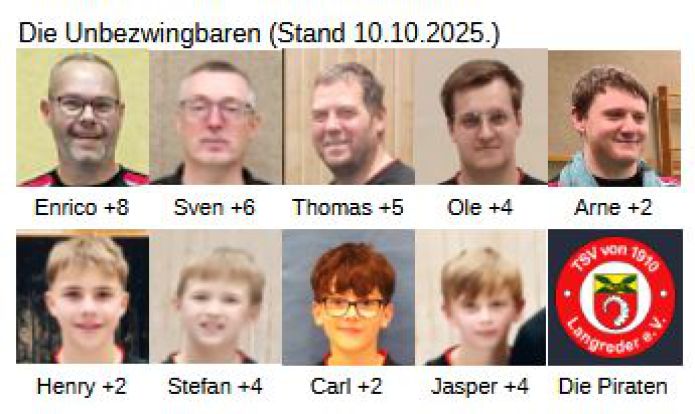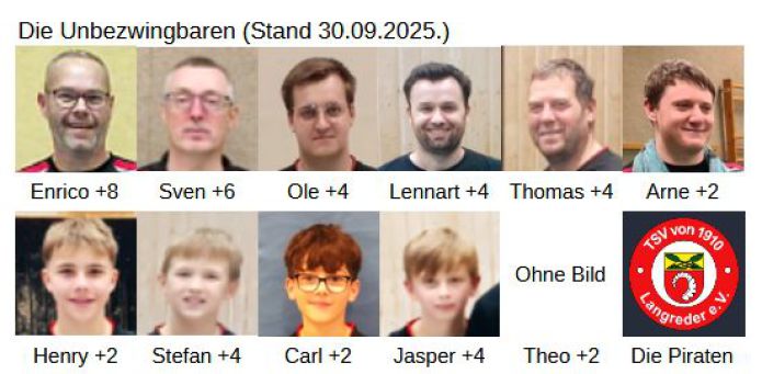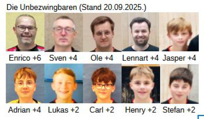 Frank Glaubitz verlor leider ein Spiel und wurde aus der Liste entfernt. Es gibt noch 1 Mannschaft (1.He), die noch nicht zum Einsatz kam, sowie einige Aktive, die noch kein Spiel absolviert haben. Mal sehen, wer sich in der nächsten Liste eintragen kann….. Von PB