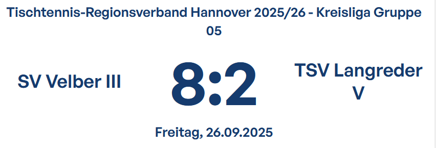 Gleich zu Beginn gingen beide Doppel (Wichmann/Kazemi vs Robert/Christian und Rathjens/Gewalt vs Dieter/Peter) unglücklich mit 3:1 an Velber. Auch die nächsten 4 Einzel verlor Langreder. Wichmann vs Straub 3:1, Rathjens vs Hartmann 3:2, Gewalt vs Dyrla 3:1, Kazemi vs Böhm 3:0. Spielstand 6:0 gegen uns, hier war schon alles gelaufen. Dieter holte mit 3:1 gegen Wichmann den ersten Zähler. Robert verlor knapp gegen Rathens mit 2:3, Peter holte den 2.Punkt gegen Gewalt mit 3:1 bevor Christian im letzten Spiel gegen Kazemi mit 1:3 unterlag. Endstand 8:2 für Velber. Hätte ein bisschen besser für uns laufen können, aber Velber wurde seiner Favoritenrolle gerecht. Das nächste Spiel ist wieder gegen Velber, diesmal Heimspiel im Pokal. Von PB