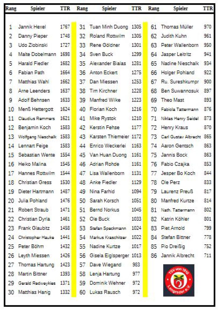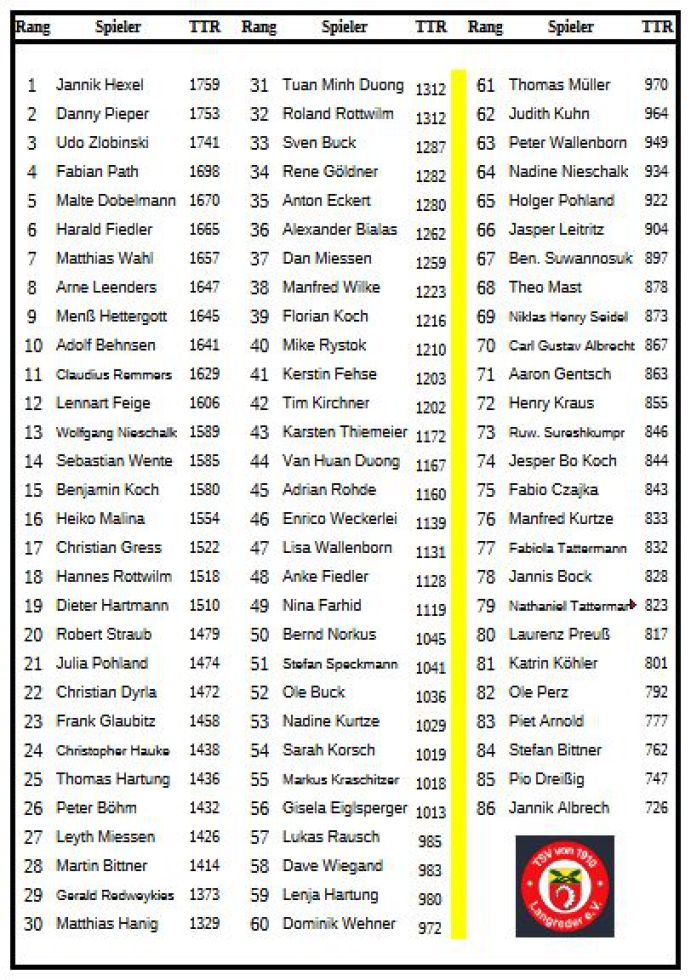 Alle Mannschaften waren nun schon im Einsatz. Die Eine oder Andere konnte ihre Position in der Tabelle verbessern, sowie auch die dazugehörigen Aktiven in der Liste. Bei den den Herren wird unser Youngster Jannik Hexel immer besser und führt nun zu Recht die Liste an. Hinter ihm liegt Danny Pieper. Auf Platz 3+4 liegen Udo Zlobinski und Fabian Path. Bei den Damen führt Julia Pohland vor Kerstin Fehse. Platz 3+4 belegen hier Lisa Wallenborn und Anke Fiedler. Bei der Jugend liegt Adrian Rohde klar vor Lukas Rausch. Auf Platz 3+4 liegen hier Jasper Leitritz und Benjamin Suwannosuk. Weiterhin an Alle viel Erfolg und dass jeder für die nächste Liste mehr TTR-Punkte einfährt. Von PB