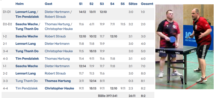 Punkte durch: Doppel (1), Dieter Hartman (2), Robert Straub (2), Christian Dyrla (2), Christopher Hauke (1). Tabelle/Bilanzen