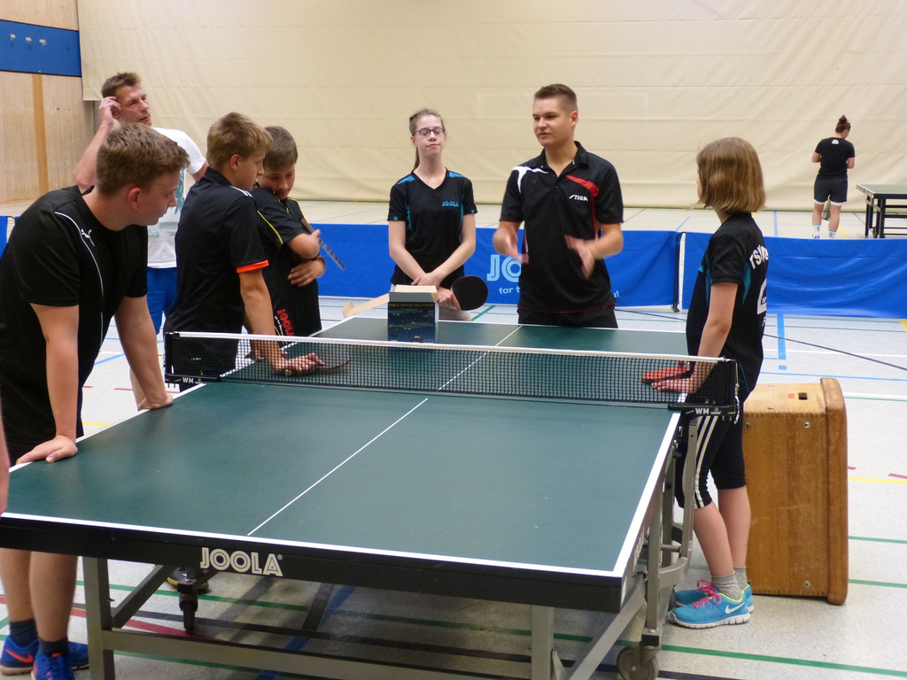 Wer keinen eigenen Tischtennisschläger hat, bekommt einen von mir. Wir werden mit Spaß und verschiedenen Spielen an das Thema Tischtennis herangehen. Mir selber macht am meisten der Rundlauf um einen Riesentisch spaß. Hier werden 4 Tische zusammengestellt und man muß versuchen den Ball über eine Bande zu spielen.